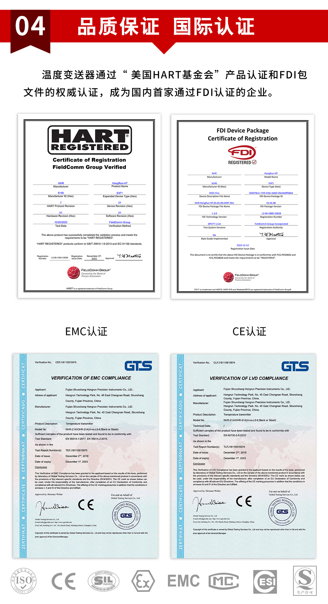 虹潤公司是專業(yè)生產(chǎn)溫度變送器的國家專精特新“小巨人”企業(yè)。生產(chǎn)的現(xiàn)場顯示隔離溫度變送器,具有可修改輸入信號類型,測量精度高,穩(wěn)定性好,帶HART或RS485通訊計等特點。該產(chǎn)品不僅通過德國萊茵 CE 認證與 SIL 功能安全認證,還獲得具備減震抗干擾能力的溫度變送器、信號隔離器、一種二端子模塊、無源信號隔離器等3項國家發(fā)明專利。主持起草物聯(lián)網(wǎng)智能溫度儀表、現(xiàn)場設備工具(FDT)接口規(guī)范、工業(yè)過程測量和控制系統(tǒng)用溫度變送器等3項國家標準,以及通信系統(tǒng)多通道數(shù)據(jù)采集控制終端規(guī)范軍用標準。參與國際5G標準制定,取得高精度溫度變送器等3項相關軟件著作權。產(chǎn)品廣泛應用于石油、化工、電力、冶金、制藥、食品、水處理等各種工業(yè)領域。